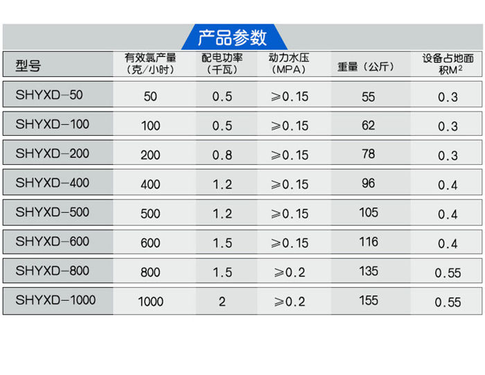 型號 | 氯產(chǎn)量(g/h) | 耗鹽量(Kg) | 功率(KW) | 電源電壓 | 外形尺寸(L×B×H)mm | 管徑(mm) | 重量(kg) | |